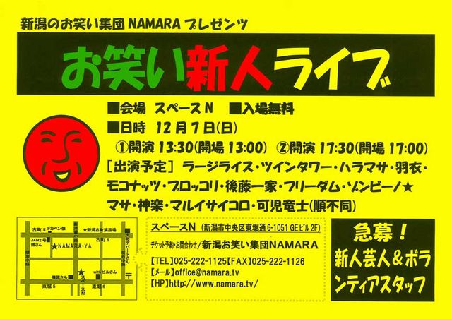 ◇12/7お笑い新人ライブ ■会場 スペースN ■日時 12月7日(日) ?開演13:30(開場13:00) ?開演17:30(開場17:00) にいがたお笑い大賞で活躍したニューフェースが登場!! ここからスターが誕生するか?ぜひ見届けてください。