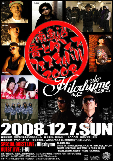 南魚沼゛音とダンスフェスティバル” 日時:2008/12/07(日曜日)17:00〜21:00 会場:南魚沼市民会館 多目的ホール 入場料:高校生以上1000円 (中学生以下は無料ですが必ず保護者同伴とします) ※売上金全額を「2009・フェニックス花火」に寄付致します。 出演アーティスト: ■SPECIAL GUEST LIVE■ Hilcrhyme ■GUEST LIVE■ J−RU ■DJ■ HORI/OKA ■MC■ O−GA/KIDALT/核弾頭/SP/S2-AK/B2M/飛王 ■SINGER■ M</CO ■DANCER■ STALE SOUL/NOW TEQUE/M.P.S2.R/道化師/HEADZ/CHARM/MACK10/Y-