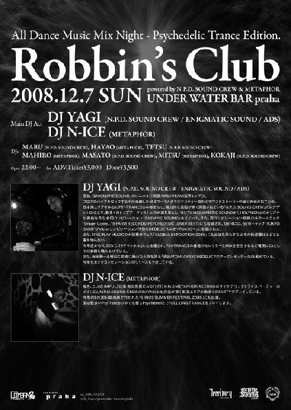 ■Main DJ Act DJ YAGI (N.P.D.SOUND CREW/ENIGMATIC SOUND/ADS) DJ N-ICE (N.P.D.SOUND CREW/METAPHOR) ■DJs MARU(N.P.D.SOUND CREW) HAYAO(METAPHOR) TETSU(N.P.D.SOUND CREW) MAHIRO(METAPHOR) MASATO(N.P.D.SOUND CREW) MITSU(METAPHOR) KOKAJI(N.P.D.SOUND CREW) START 22:00 ADV \3,000 DOOR \3,500