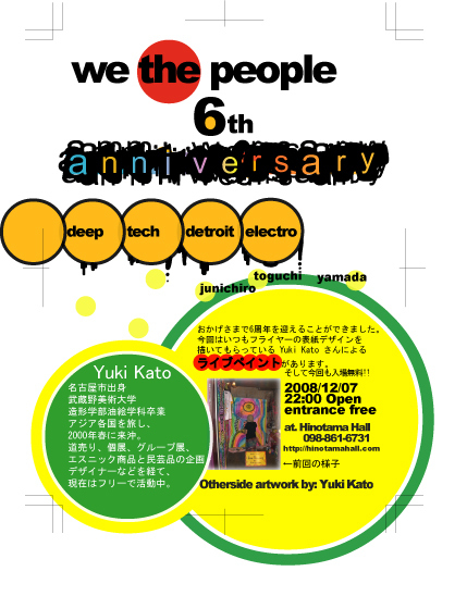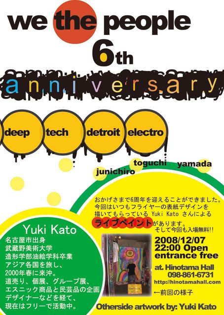 we the people 6th anniversary!!! 2008/12/07 22:00 Open entrance free Hinotama Hall http://hinotamahall.com 098-861-6731 おかげさまで6周年を迎えることができました。 今回はいつもフライヤーの表紙デザインを 描いてもらっている Yuki Kato さんによる ライブペイントがあります。 そして今回も入場無料!! yuki kato profile 名古屋市出身 武蔵野美術大学 造形学部油絵学科卒業 アジア各国を旅し、 2000年春に来沖。 道売り、個展、グループ展、 エスニック商品と民芸品の企画・ デザイナーなどを経て、 現