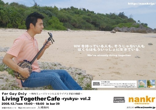 沖縄ミュージシャンと盛り上がりましょう! 12月1日は世界エイズデーです。 この時期にもう1度HIVやエイズについて考えてみませんか? Living Together計画(L.T.計画)という プロジェクトがあります。 HIVを持っている人も、持っていない人も、 すでに、一緒に生きている。 そんなリアリティーを共有するために、いろいろな形で メッセージを発信しているプロジェクトです。 ここ沖縄でも、このL.T.計画に沿ったイベントを開催します。 12月7日(日)に県内で2回目となるLiving Together café 。 今回は