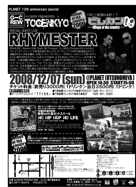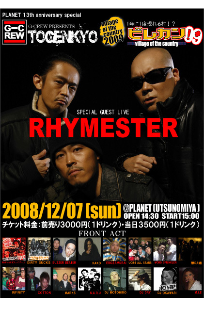 来る2008.12.07(sun)あの伝説のイベントが…… 記憶にも新しい昨年10月に開催された野外イベント『ヴィレッジ オブ ザ カントリー』、動員数2000人を超えたあのイベントと宇都宮を代表する長寿イベントG-CREW PRESENTS『TOGENKYO』がコラボイベントを開催致します SPECIAL GUESTに何と RHYMESTER を迎えます RHYMESTER… 宇多丸(MC),Mummy-D(Mr.Drunk:MC/Producer),DJ JIN(DJ/Producer)の三人からなり『キング・オブ・ステージ』の称号を冠するHIP HOP グルー