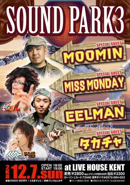 前回好評だったクラブカルチャーのアーティストをオールナイトのクラブイベントで無くLIVEオンリーで行うSPECIAL LIVEイベント SOUND PARK です! 今回もエンターテイナーなアーティストが出演します! 詳細 ■2008/12/7(日) ■タイトルSOUND PARK 3 ■料金 ADM¥2800- DAY\3300- ドリンク別 Lコード 73440 ■OPEN 18時 ■会場 UTUNOMIYA KENT 〒320-0804. 栃木県宇都宮市. 二荒町4-7天池ビル2F ■出演者 MOOMIN / MISSMONDAY / EELMAN / タカチャ
