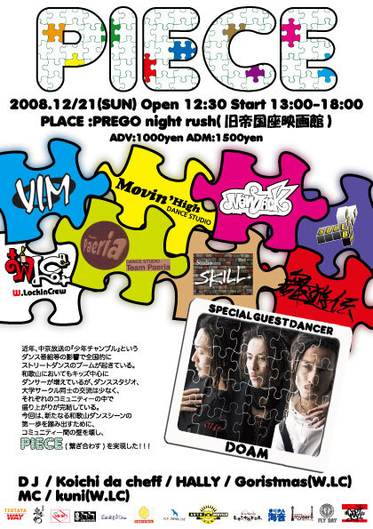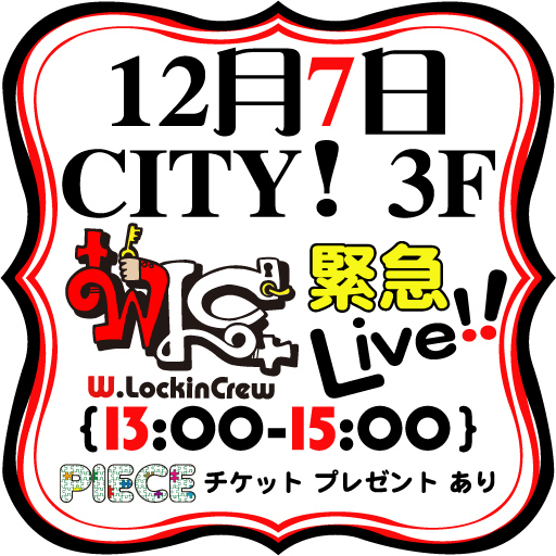 13:00〜15:00 観覧無料!! W.Lockin Crew 緊急Live 本物のストリートDanceが見れる!! PIECEのチケットプレゼント企画あり!! 暇な人はぜひ遊びに来ましょうw
