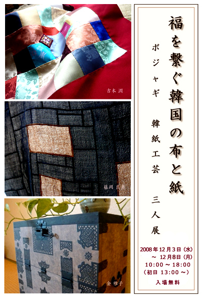 福を繋ぐ韓国の布と紙 〜ポジャギ・韓紙工芸 三人展〜 ☆入場無料☆ 韓国の伝統ポジャギ(パッチワーク)と韓紙工芸(ペーパークラフト)の展示と、お洒落なコリアン雑貨(小物)の販売。 開催日時:2008年12月3日(水)〜8日(月) 10:00〜18:00(最終日は17:00迄) 会場:アートサロン空 (駅前北口ケンタッキーの角を住宅街の方面に入って、すぐ右手にある一軒家のギャラリー) お気軽に遊びに来ていらしてください♪♪^^