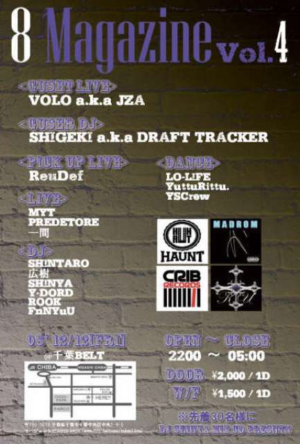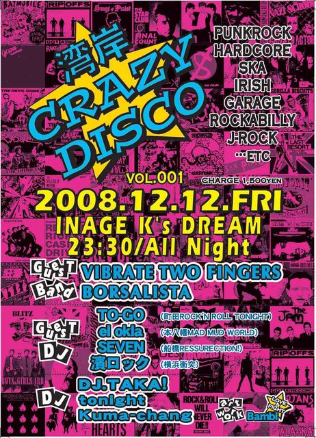 最近は千葉県内でもロック系のクラブイベントは増えつつある様ですが、この「湾岸CRAZY DISCO」では毎回バンドも2つほど呼んでハデに、そして不良の集まる刺激的なものにしたいと思っています。ロックにまみれて、ガンガン美味い酒を飲みましょう!