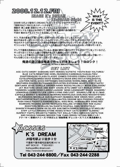稲毛K's Dreamにて、新たにロックなクラブイベントをスタートさせます。12月より偶数月・第2金曜深夜で、毎回2バンド出演でハデにやっていきたいと思っていますので、みなさんぜひ飲みに来て下さい!
