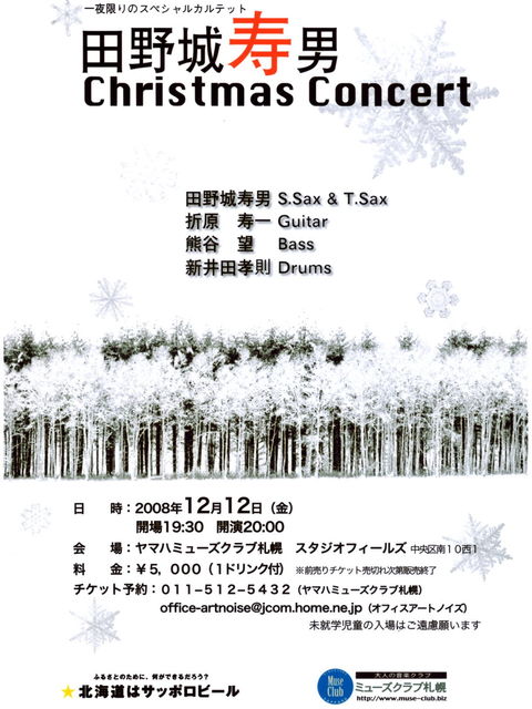 サックス奏者田野城寿男のクリスマスコンサートも とうとう今週末に迫ってきました! ドラマーの新井田さんには ニューヨークへ帰国されるのを ちょっと待っていただきました〜☆ ベーシストに熊谷さん、ギタリストは初共演となる折原さん を迎えて一夜限りのスペシャル・カルテットがいよいよ実現!! 北海道を代表するミュージシャンが 集まった豪華なリズムセクションに 田野城の生音がどのように 科学反応をおこすのでしょうか? 今回はアルコールもご用意します。 お酒を楽しみながら、極上なジャズサウンドで 心も身体も温か