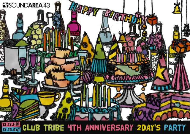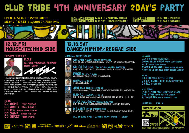 2008/12/12(fri),13(sat) Club Tribe presents "Club Tribe 4th Anniversary 2DAY's Party" "SOUND AREA vol.43" ☆2DAY's共通TICKET☆ 2,000yen(限定150枚) (出演者、各サポートショップにて販売します) ☆ENTRANCE☆ *2DAY's TICKET提示 12/12(fri):500yen/1DRINK 12/13(sat):500yen/1DRINK *DOOR 12/12(fri): 2,500yen 12/13(sat): 3,000yen ◎◎2008/12/12(fri)◎◎ ♪♪♪♪♪♪HOUSE,TECHNO SIDE♪♪♪♪♪♪ ☆OPEN & START☆