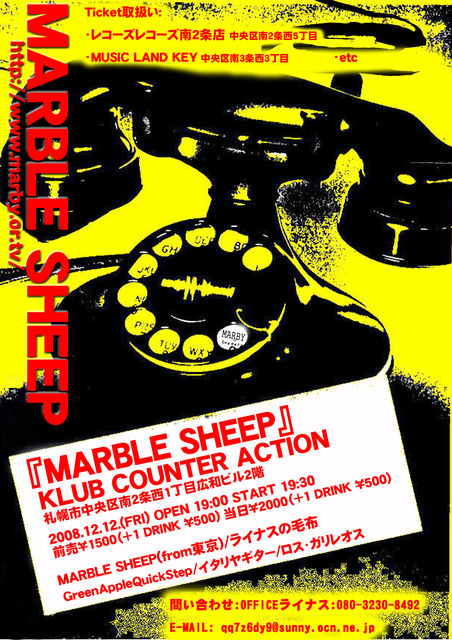 初日にMarble aSheepのKENのソロプロジェクトMICKEY GUITAR! 二日目にMARBLE SHEEPです! 12/11(THU) Hall Spiritual Lounge 札幌市中央区南2西4丁目10番地 ラージカントリービル(LCビル)B1F 011-221-9199 http://spirituallounge.jp/hall/ 『φ』 open 18:00 start 18:30 adv \1,500 + 1 drink d \2,000 + 1 drink Mickey Guitar(ken + iwamotor) ニノウデ My Blueberry Nights Volcano Kekeva Anbrazza guenon The Gainz ・・・・・・・・・・・・・・・・・・・・・・・・・・・・・・・・・・・・