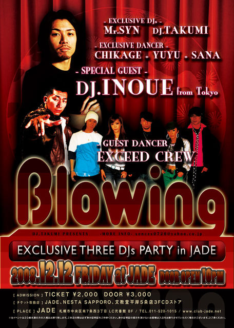 来週の『Blowing』は、渋谷HARLEMの土曜日『BLOW UP』で活躍中のレギュラーDJ 『INOUE』をDROP なんと今回は旭川の『Mr SYN』と『DJ TAKUMI』の3DJで1NIGHTを作り上げます 3人だからこそ出来る流れを作る『PARTY』にしたいと思います。 DANCERには、毎回かなりの良いSHOWを見せてくれる『EXCEEDCREW』と『CHIKAGE+SANA+YUYU.』が出演します Blowing 2008.12.12(fri) OPEN_22:00- @JADE(札幌市中央区南7条西3丁目LC弐番館B1F) adv_2000 door_3000 SPECIAL GUEST_INOUE from Tokyo GUEST DANCE_EXCEED CREW DJ_M
