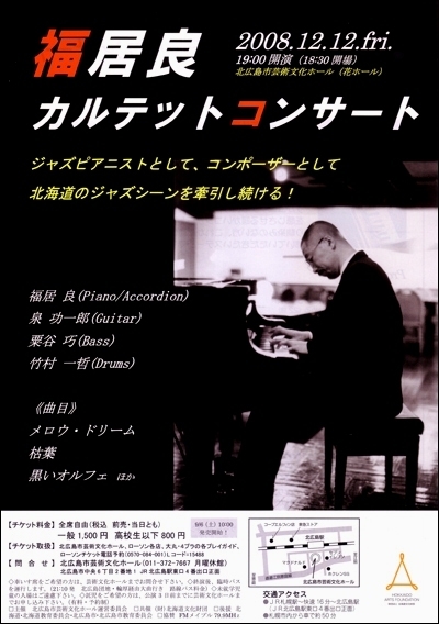 「Jazzベーシスト粟谷巧(あわやたくみ)」コミュ管理人のm a y u ♪と申します。 貴重なスペースお借りいたします 札幌在住でビバップといえばこの人・・・ Jazzピアニスト「福居良」のコンサートのお知らせです 福居良カルテットコンサート 福居良(p,acc)泉功一郎(g)粟谷巧(b)竹村一哲(ds) 12/12(金) 18:30開場 19:00開演 チケット料金(全席自由)前売・当日とも 一般¥1500 高校生以下¥8