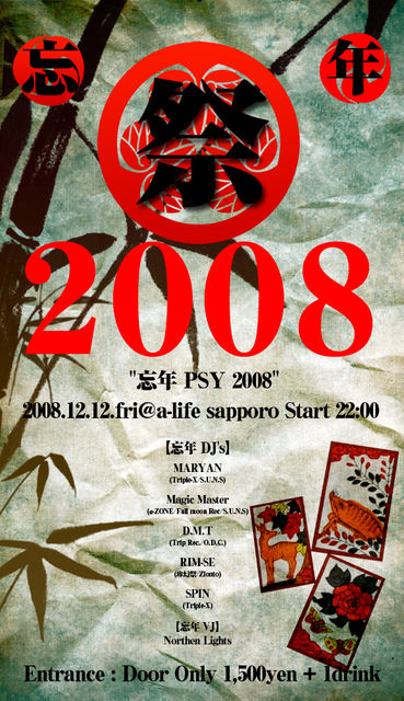 "忘年 PSY 2008" @a-life sapporo 2008.12.12.fri Start 22:00 【忘年 DJ's】 MARYAN(Triple-X/S.U.N.S) Magic Master(α-ZONE/Full moon Rec/S.U.N.S) D.M.T(Trip Rec./O.D.C.) RIM-SE(珍幻祭/Zionto) SPIN(Triple-X) 【忘年 VJ】 Northen Lights 【Entrance Fee】 Door Only 1,500yen + 1drink http://ip.tosp.co.jp/i.asp?i=triple_x_north