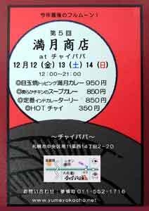 みなさんこんにちは 寒さ日に日につのります。美味しいカレーをたべてあったまりましょう。 12月13日は今年最後のフルムーンです。 12月12日(金)13日(土)14日(日) の3日間満月商店開店します! 営業時間は12:00〜21:00となります。 【MENU】 ◎満月カレー ボリューム満点の当店NO.1の人気メニュー。ターリーorスープカレーに目玉焼きトッピング。・・・950円 ◎チキンターリー 不動の定番メニュー。ニンジンジャガイモピーマンナスしめじにやわらかモモ肉を使ったインドのお母さんカレー。・