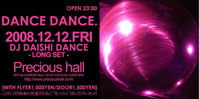 告知失礼します。 毎月恒例プレシャスホールでLONG SET DJです! 札幌では今年ラストのロングセットDJです。 2008.12.12.FRI 23:00 OPEN DANCE DANCE @Precious hall(札幌) http://www.precioushall.com/dancedance/index.html DJ DAISHI DANCE -LONG DJ SET!- FLYER 1000YEN / DOOR 1,500円 ここの画像プリントアウトか当日携帯画面で表示で1,000円で入場OKです。 ★先着200名様にノベルティーMIX CD"冬HOUSE"(非売品)プレゼントです! 北海道の皆様、大集合よろしくお願いします!!!