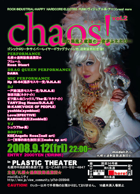 管理人様 告知失礼いたします あの混沌の夜がパワーアップして再び! ダークでポップで過激でハッピー! 聞いて驚け!見て笑え! chaos!chaos!chaos!chaos! rock・punk・industrial・hardcore・happy hardcore・electro・ヴィジュアル系・アニソン・gabba・j-pop・dark rock・ Gothic・ロリイタ・サイバー・レイヤー・ドラァグクィーン他、過剰装飾総登場 ★【chaos!vol.2】★ 9月12日金曜日 22:00〜 atプラスチックシアター (札幌市中央区南5条西1丁目 北一ビルB1 011-512-4847) パフォ