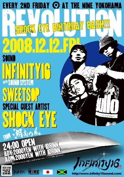 12月のREVOLUTIONは遂に登場、韋駄天ことSHOCK EYE!!この日はSHOCK EYEのBIRTHDAY BASHもやるので、皆でお祝いしましょう!!TELA-CのBLOGではクリスマスパーティ一緒にやっちまうかなんて書いてあったので、とても楽しいDANCEになる事間違いなし!!もしかしたらあの曲も聴けるかもですね!!!前売り券情報を入手したら、すぐに報告します!!