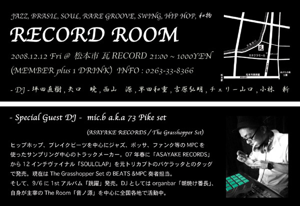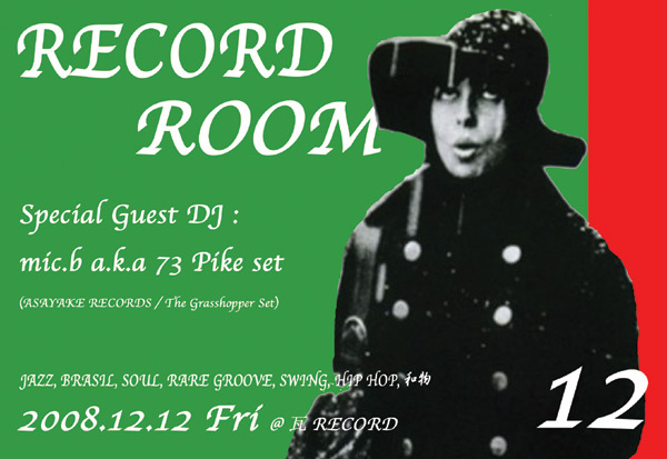 忘年会シーズン到来!今週は真っ盛りデスネ! さて、今年最後のRECORD ROOM は、東京からゲストDJとしてmic b a.k.a 73PikeSet(ASAYAKE RECORD The Grasshopper Set)を迎えて開催しまーす。 ◆◆◆RECORD ROOM◆◆◆ 【DATE】 12/12(fri) 21:00〜3:00 【参加費】 ¥1000 (mail memberは+1DRINK) 【Guest DJ】 mic.b a.k.a 73 Pike set(ASAYAKE RECORDS/The Grasspopper Set) 【DJs】 坪田直樹 西山源 早田和重 矢口暁 チェリー山口 吉原弘明 小林新 ===JAZZ,EASY LISTENING,RARE GROOVE,FUNK,和物,HIP-HOP=== *