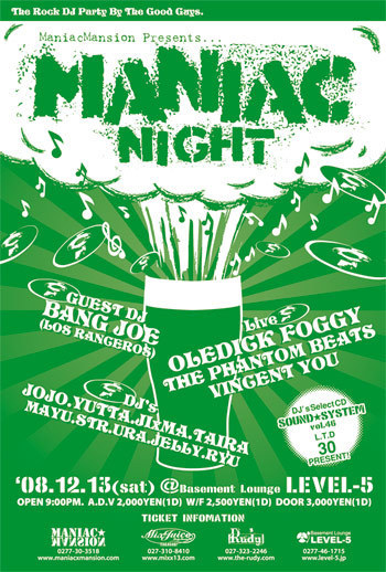 昨夜のKISS!KISS!KISS!ではお世話になりました。 告知失礼致します。 2008年のラストを飾る12月のMANIAC NIGHTは、今年のフジロック'08「ROOKIE A GO-GO」にも出演したOLEDICK FOGGYを迎えての開催。 更にMANIAC NIGHTではお馴染みのBANG JOE(ロスランチェロス)もゲストDJ参戦! 現在連続出演記録(?)更新中のTHE PHANTOM BEATS、そしてイギリス修行より帰還した元TEDDY BOYSのVincent Youもソロ出演! 是非とも遊びに来て下さい。 『MANIAC NIGHT』 2008.12.13(sat) @Basement Lounge LEVEL-5 OPEN 9:00PM. LIVE : OL