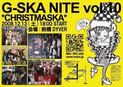 G-SKA NITE vol.10 vol.10 *CHRISTMASKA* PRODUCED by Mini-SKA [DATE] 2008.12.13(土) 18:00 OPEN/START [PLACE] 前橋DYVER 027-221-7301 群馬県前橋市本町1-7-3 http://www.dyver.jp/ [PRICE] 前売1,500円+1D 当日1,800円+1D [BAND] CHECKMATEZ(東京) 緋の旅団(東京) 向日葵 TREASURE HUNTER Mini-SKA ※先着30名に出演バンドの音源を収録したG-SKA CD-Rを無料配布します! ※クリスマスカということで、出演バンドがクリスマスソングを演奏します!