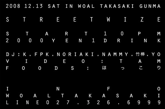 momoちゃん、告知失礼致します。 おかげさまで、2008 streetwizeも今回でラストです。わいわいガヤガヤ楽しくやりたいと思います。でも攻める時は攻めるつもりです。 アラフォー万歳! 2008 12.13 SAT @Woal Takasaki, Gunma STREETWIZE start 22:00 入場料 2000yen/1drink Dj// K. FPK. NORIAKI. NAMMY. 竹 棒. YO Video//TAM Food//ほっこり GENRE/ techno.house.dub.dnb.&more rebel music! info// woal@takasaki woal line.027.326.6999 @@@http://members3.jcom.home.ne.jp/woal @@@@http://