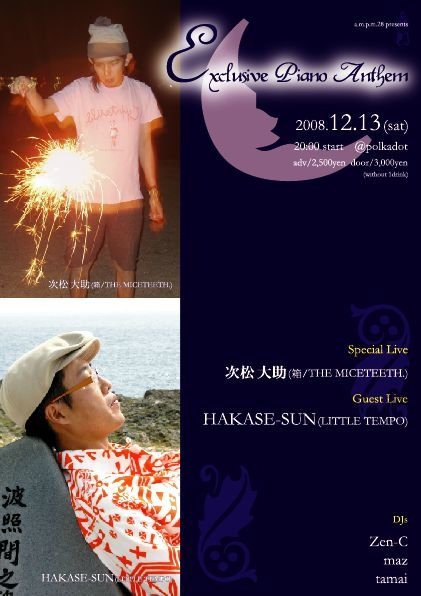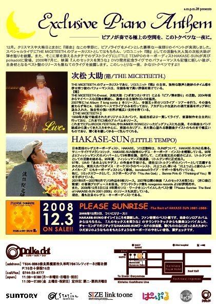 管理人様告知失礼いたします。 ■12/13(sat)■ a.m.p.m. 28 Exclusive Piano Anthem 【time】2008/12/13(sat) 20:00〜 【place】cafe polkadot(奈良県橿原市) 【door】adv/2,500yen door/3,000yen 【Special Live】次松 大助(箱/The Miceteeth.) 【Guest Live】HAKASE-SUN(LITTLE TEMPO) 【more info】http://www.cafe-polkadot.com/ 寒空の季節、ココロに沁みわたるピアノの音色を…。 今回は注目のピアニストが豪華ライヴ。 スペシャルライヴに、ザ・マイスティースのヴォーカリストであり、 ソロプ