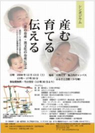 天理大学で「シンポジウム 産む・育てる・伝える―昔のお産・異文化のお産に学ぶ」が開催されます。 周産期医療の危機が叫ばれる昨今の状況、こうした産と育をめぐる身体の歴史をとらえなおす試みが重要性を増していることは確かです。 奮ってご参加下さい。 主催:天理大学文学部歴史文化学科考古学・民俗学研究室 日時:2008年12月13日(土) 13時〜17時30分(12時30分より受付) 場所 天理大学杣之内キャンパスふるさと会館(9号棟) JR天理駅・近鉄天理駅より徒歩25分 *天理駅より送迎バス運行(12時20分より)