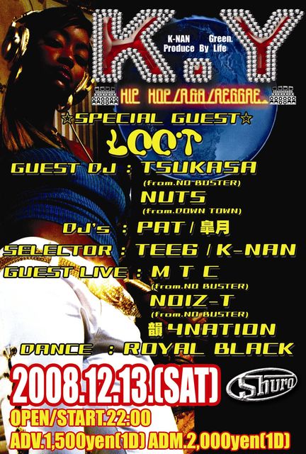 『K.Y』 every 2nd Satyrday 毎月第2土曜日 OPEN 22:00〜 ◆SPECIAL GUEST◆ 「LIVE PAINTING」LOOT ◆GUEST DJ◆ TSUKASA / DJ NUTS ◆DJ◆ PAT / 皐月 ◆SELECTOR◆ TEE6 / K-NAN ◆GUEST LIVE◆ MTC / NOIZ-T ◆LIVE◆ 韻4NATION ◆DANCE◆ ROYAL BLACK and more… *ENTRANCE FEE : 2.000yen 1d / ADV 1.500yen 1d HIPHOP / R&B / REGGAE / HOUSE