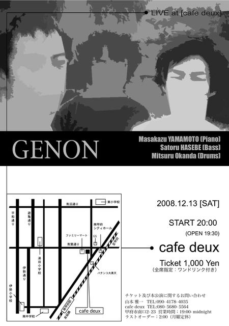 管理人様 いつもお世話になっております。 昨年11月にcafe deux様でのライブを皮切りに活動を開始させて致しましたが、1年ぶりにまたこの場で公演が実現する事をメンバー一同心から感謝しております。 今回は、ドラムに新メンバー大神田充氏を迎え新しいサウンドとなったGENONをお届け致します。 寒さが増す時節柄ではございますが、どうかお気軽に遊びにきて頂ければ幸いです。 GENON代表 山本雅一 ------------------------------------------------------------------------- 日時:12/13(土)20:00開演(19:30開場) 場所:c