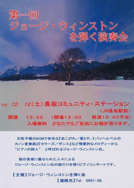 今年の12/13(土)。 山梨県の長坂町で 『第一回ジョージ・ウィンストンを弾く演奏会』 を開催します。 場所 JR中央線 長坂駅前 長坂コミュニティーステーション (確定)。 スタインウェイ・フルコンサートグランドピアノ 使用します。 客席 400 開演午後1時30分、終演午後4時40分を予定してます。 東京から日帰り、もちろん可能です。 参加資格 ジョージ・ウィンストンの曲を弾いて下さること。 ピアノの上手い下手などは全く