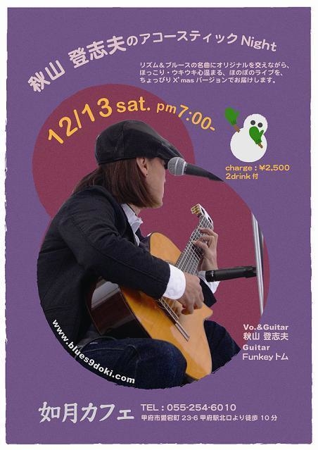 昨年11月に如月cafeで初ライブ 大人のチョ〜カッコいいライブでした。 今年もやります。 日 2008年12月13日(土曜) チャージ 2500円(2ドリンク付き) 時間 18時30開場 19時スタート 年末の忙しい時とは思いますが素敵な音楽を聴いて 力を貰いましょう。 ライブ忘年会なんてのもカッコいいね 飲んで、騒いで今年の垢を落としましょう!!