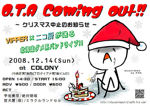 O.T.A Coming out!! ¡Ú¥Ë¥³¿ß¤¤á¤§£÷¡Û¥¯¥ê¥¹¥Þ¥¹Ãæ»ß¤Î¤ªÃΤ餻¡ÚVIP¤Ï¤æ¤È¤ê£÷¡Û VIPPER¡ß¥Ë¥³¿ß¤Ç¤ªÁ÷¤ê¤¹¤ë¡¢Ë̳¤Æ»¥À¥á·Ï¥Ð¥ó¥É¥é¥¤¥Ö¡ª¡ª VIP¤Ç¥ª¥¿¥Ð¥ó¥¹¥ì¤Î¥á¥ó¥Ä¤Ç¥é¥¤¥Ö¤ä¤ë¤ª(¡°¦Ø¡°¡¡) Æü»þ¡¡2008/12/14(Æü) ³«¾ì¡¡14:30 ³«±é¡¡15:00 ¾ì½ê¡¡COLONY(Æî7À¾4¥À¥¤¥¢¥ÊÆî7¾ò¥Ó¥ëB1) ÃϿޡ¡http://www.colony6.com/images/accessmap.jpg Á°Çä/¥Õ¥é¥¤¥ä¡¼»ý»²¡¡\500 ÅöÆü \600 ½Ð±é ¡¦±§º´ÈþƦ(¥¯¡¼¥ë·Ï¥¨¥í¥²¥½¥ó¥°¥Ð¥ó¥É) ¡¦ÀäÂÐÎΰè(VIP¤Ç¥ª¥¿¥Ð¥ó¥¹¥ìȯ¥Ï¥¤¥Æ¥ó¥·¥ç¥ó¥Ð¥ó¥É) ¡¦Å¯¸¤²°(¥¤È¿)(¥Ë¥³¥Ë¥³¥Ð¥ó¥É¥ª¥Õ»¥ËÚȯ¡¢