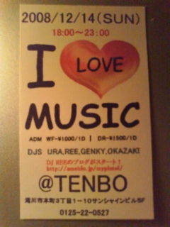 º£Ç¯ºÇ¸å¤Î"IMUSIC"¤Ç¤´¤¶¤¤¤Þ¤¹ º£Ç¯£±Ç¯¤¢¤ê¤¬¤È¤¦¤´¤¶¤¤¤Þ¤·¤¿´¶¼Õ¤Îµ¤»ý¤Á¤ò¹þ¤á¤Æ´èÄ¥¤ê¤Þ¤¹¤Î¤Ç¡¢£±Ç¯Ê¬¤Î¥¹¥È¥ì¥¹¤ò°û¤ó¤À¤ê¡¢¾Ð¤Ã¤¿¤ê¡¢¥·¥ã¥¦¥È¤·¤¿¤ê¡¢¤Þ¤Ã¤¿¤ê¤·¤¿¤ê¤·¤ÆÈ¯»¶¤·¤Æ¤ß¤Æ¤Ï¤¤¤«¤¬¤Ç¤¹¤«¡©¾¡¼ê¤Ë"˺ǯ²ñ"´¶³ÐŪ¤Ê´¶¤¸¤Ç ³°¤Ï´¨¤¤¤±¤É¤³¤ÎÆü¤ÎÌë¤ÎTENBO¤ÏÇ®¤¯¤Ê¤ë¤È»×¤¤¤Þ¤¹ ¤µ¤¡¤ß¤ó¤Ê¤ÇÂìÀî¤Ë¤¤¤Ê¤¬¤éClub¤òÂ賤·¤Á¤ã¤ª¤¦¿§¤ó¤Ê¶Ê¤òʹ¤¤ËÍè¤Æ¤¯¤À¤µ¤¤¤Í IMUSIC 12/14 ¡ÊSUN¡Ë 18:00¡Á23:00 DJ s DJ URA DJ REE DJ GENKY DJ OKAZAKI