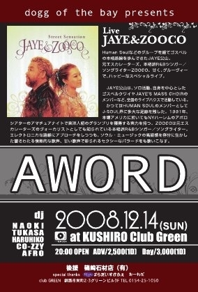 DJ NAOKI TUKASA HARUHIKO CO-ZZY AFRO LIVE JHAY&ZOOCO ADV 2500(1D) DAY 3000(1D) 20:00 OPEN ¾ì½ê club GREEN 3F.Green BLD 2-3.sakaemachi KUSHIRO 0154-25-1050 Human Soul¤Ê¤É¤Î¥°¥ë¡¼¥×¤ò·Ð¤Æ¥´¥¹¥Ú¥ë¤ÎËܳÊÏ©Àþ¤òÊâ¤ó¤Ç¤¤¿ JAYE¸ø»³¡£¸µ¥¨¥¹¥«¥ì¡¼¥¿¡¼¥º¡¢ËܳÊÇÉR&B¥·¥ó¥¬¡¼¡¿¥½¥ó¥°¥é¥¤¥¿¡¼ ZOOCO¡£ JAYE¸ø»³¤Ï¡¢¥½¥í³èư¡¢¼«¿È¤òÃæ¿´¤È¤·¤¿¥´¥¹¥Ú¥ë¥¯¥ï¥¤¥äJAYE'S MASS CHOIR¤Î¥á¥ó¥Ð¡¼¤Ê¤É¡¢Á´¹ñ¤Î¥é¥¤¥Ö¥Ï¥¦¥¹¤Ç³èư¤·¤Æ¤¤¤ë¡£¤«¤Ä¤Æ¤ÏHUMAN SOUL¤Î¥á¥ó¥Ð¡¼¤È¤·¤ÆJ-SOUL³¦¤Ë¿Âç¤ÊÂÀפò»Ä¤·¤¿¡£1