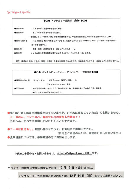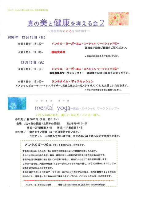 2008年 12月15日(月)-16日(火) 岐阜県.高山にて 年内ラスト!メンタルヨーガスペシャルワークショプ IN 高山 第二弾開催 今回のテーマ潜在意識のこころをひきだす ■15日 第一部14:30〜 メンタルヨーガ 第二部19:00〜 親睦食事会 ■16日 第三部10:15〜 メンタルヨーガ 第四部12:00〜 ランチタイムディスカッション メンタルヨーガは前回よりもさらに一歩深めた「潜在意識」に焦点をあて実践していきます!!!! どうぞお楽しみに 関東より参