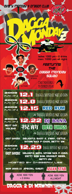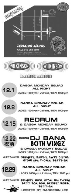 ●12/15 RED RUM & DAGGA MONDAY SQUAD ※ADM※ Ladies:1000 yen + 2 drinks / Men: 1000 yen *DRAGON CLUB* * * 横浜市中区曙町1-2ドラゴンビル 045-262-2601 http://www.dragon-club.asia/ * * * * *