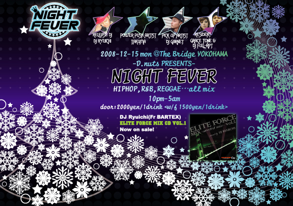 D.nuts crew presents NIGHT FEVER at BRIDGE YOKOHAMA NIGHT FEVER mixi コミュニティー http://mixi.jp/view_community.pl?id=1800572 12月15日 月曜日 OPEN 22:00 CLOSE 5:00 HIPHOP,R&B,REGGEAandALL MIX Door 2000yen/1drink 2008年1年間に渡り毎月横浜の平日を盛り上げて来たエンターテイメント集団D.nutsのプロデュースするイベントNIGHT FEVER!!今回は年末スペシャル! 毎回THE BRIDGE YOKOHAMAでは大騒動! シャンパン完売はもちろん!テキーラも残り一滴まで残さない前代未聞の