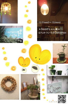 クリスマスの少し前、街ではクリスマスソングが流れ、イルミネーションが輝きだす頃、chicaにとってとても大切なcafeで、展示をします。 一年頑張った自分に、大切な誰かへ、クリスマスプレゼントを探しに、 ふらりと立ち寄っていただけたらうれしいです。 またcafe内にて、ハートがちょこんと色んなところに隠れています。。 2つみつけた人には、もしかしたらサンタクロースからのプレゼントがあるかもしれません、よ☆ 今年最後の個展です。。 ぜひお世話になったあなたに、 いつも見守ってくださるあなたに、 見