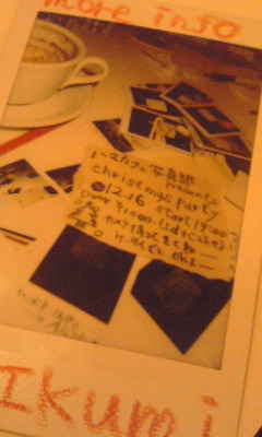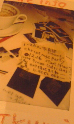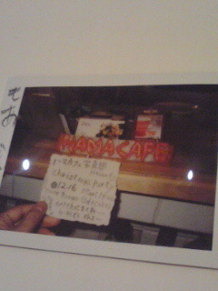 さあ、いよいよ来週になりましたよう! クラッカーとか鼻眼鏡とかミニスカサンタ衣装をご準備の上、是非是非みなさまご参加ALLEY! 〜・〜・〜・〜・〜・〜・〜・〜・〜・〜・〜・〜・〜・〜・〜・〜・ ハマカフェ写真部Presents ChristmasParty! @HAMACAFE DEC.16,2008 / start 19:00- (end ???) Door 1,000yen (incl. 1d + CAKE) MUST item -> CAMERA (offcourse KEITAI do) 〜・〜・〜・〜・〜・〜・〜・〜・〜・〜・〜・〜・〜・〜・〜・〜・ ちう訳でさ、1000円で飲物1杯と、くりーすまーすーなケーキがございます。2杯目以降はC