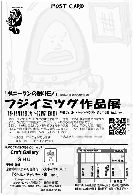 個展のお知らせです。 4年ぶりに個展をします。 詳細及びDMのPDF版は下記URLです。 http://dannykun.kyo2.jp/e74621.html ================= フジイミツグ作品展 title 「ダニークンの贈りもの」 presents of dannykun date 12月16日(火)~12月21日(月)まで open 11:00〜19:00(最終日は17:00まで) 作家在廊日 16・19・20・21日 くらふとギャラリー・集 しゅう にて TEL(075)254-3955 http://www.ac-n.com/ ※20日 17:00よりパーティです。(その後ダニークンの忘年会) 作
