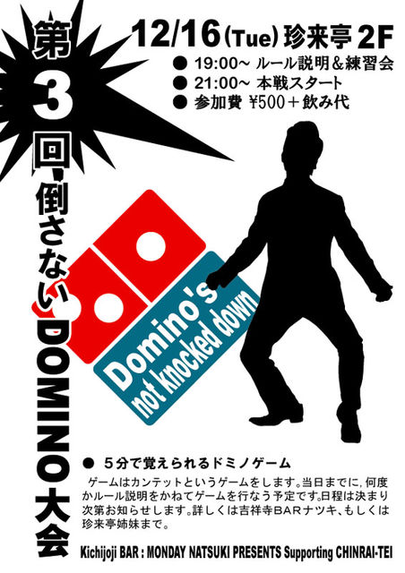 管理者様、不適切であれば削除をお願いします。 始めまして。吉祥寺ハモニカ横丁にある吉祥寺BARという飲み屋で月曜日を担当しているナツキと申します。 ドミノを流行らそうと、同じハモニカ横丁の中にある珍来亭という中華料理屋に協力をしてもらい、不定期ですがドミノ大会を開催しています。 平日の夜から、且つ酒飲みが多い場所の為、だらだらした雰囲気ではありますが、ぜひ参加いただければと思います。 12/16(火曜日)吉祥寺ハモニカ横丁 珍来亭2F ●19:00〜 ルール説明&練習会 ●21:00〜 本戦スタート 参加費 \50