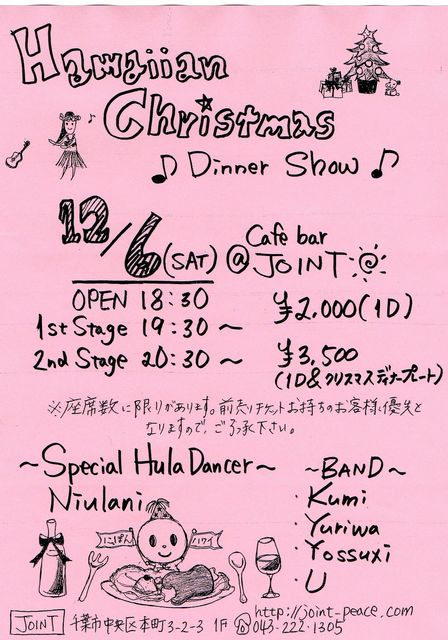 キラキラChristmasをハワイアーン♪に過ごしてみませんか? Jointのスペシャルディナーとゆったりハワイアンライブで今年はホクホクです ★Hawaiian Christmas Dinner Show☆ 12/6(Sat) @JOINT Open 18:30 1st stage 19:30 2nd stage 20:30 Ticket \2000(1D) \3500(1D& Special Christmas Dinner Plate) *座席数に限りがあります。前売りチケットをお持ちのお客様優先となります。 -Dancer- -Band- Niulani Kumi,Yuriwa,Yossuxi,U Joint:04