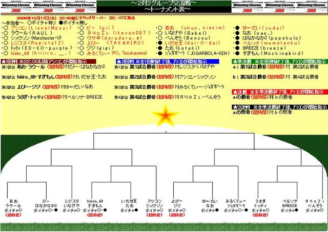 最初に!参加の際、ウイイレ専用ID(コナミID及びGAMEIDではなく、ロビーで表示されてる名前がIDです)の記載がない場合、 参加と見なしません。また、「ボイチャ有り・無し」の記載もお願いします。 出来るだけ有り・無し同士で同じ組に致します。 また、大会当日運営はロビーチャットにて行ないますので、ロビーにいるときは ロビーチャットを確認出来る画面状態にしてください。 アシコンが試合開始のアナウンスするまで勝手に試合を開始しないで下さい。 2対2グループ戦カップ[PS3版]を開催致します 今回はチーム制のトーナメ