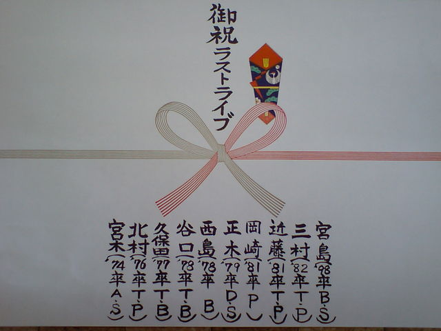 今年も12月17日にRAGである現役のラストライブに差入れを送ります 例年どおりお一人3,000円位(最終的な細かい金額は頭割り)で考えています。 16日に発送しますのでお早めにこちらへご表明お願いします。 御熨斗に卒業年度、楽器、御名前をお入れします。 写真は(中身は写ってないですが^^;)昨年のものです。