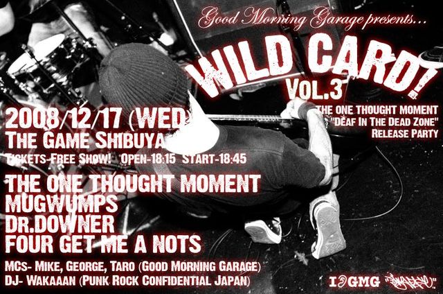 ありがとうございました。 このイベントへの申込は締め切らせていただきました! お待たせしました!今度のワイルドカードは更にすごい! Good Morning Garage presents ワイルドカード Vol.3 MixiのGMGコミュメンバー 120組240名様ご招待です。 ××未成年の方はご入場いただけません×× 日時;2008年12月 17日水曜 ( 18時15分開場 18時45分ライブ開演) 入場料;無料 (飲み物は各自ご購