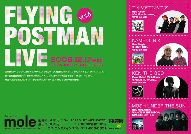 リリースしたばっかりのエイジアエンジニア/KAME&L.N.K/KEN THE 390/MOSH UNDER THE SUN皆が札幌moleに登場です!!