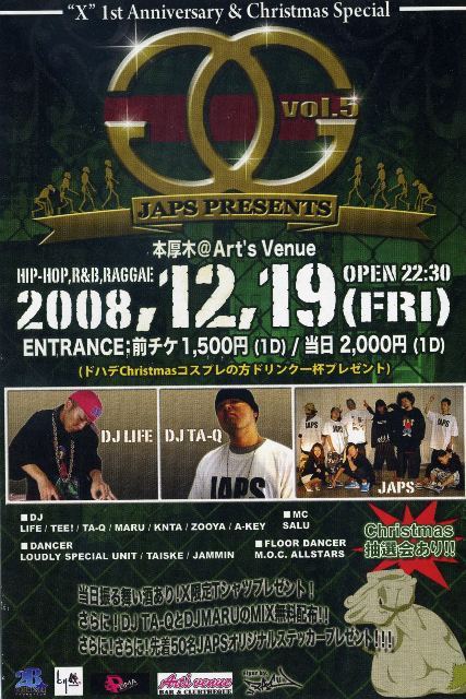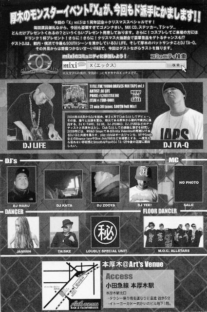 本厚木で今最も勢いのあるイベント!!! 毎回FLOORは満員!!! ぜひ遊びに来てください☆ 内容は保証します。 来れる方はメッセージを頂ければゲスト料金でご案内します。 ■2008.12.19(FRI) ■X ■本厚木ART'S VENUE ■OPEN 22:30〜 ■ENTRANCE FEE DOOR 2000YEN/1D GUEST 1500YEN/1D ■GUEST DJ LIFE ■DJ TEE! TA-Q MARU KNTA ZOOYA A-KEY ■MC SALU ■DANCE LOUDLY SPECIAL UNIT TAISUKE JAMMIN ■FLOOR DANCER M.O.C.ALLSTARS