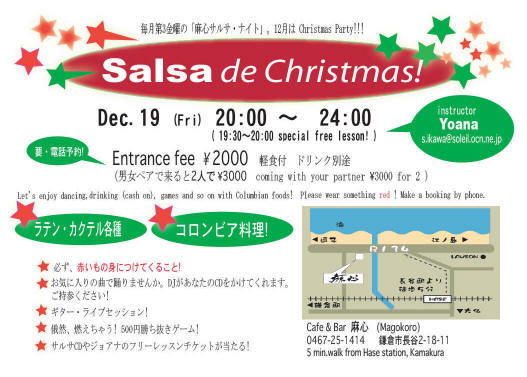 こんにちは。イベントの告知をさせてください。 鎌倉由比ヶ浜の端っこにある海に面した店「麻心」では、毎月1〜2回サルサ・ナイトがあり、もう3年目になります。 12月19日(金)には、「クリスマス・サルサ」があります。 ぜひ一緒に海を見ながら踊って、楽しくクリスマスを過ごしてください。 サルサを始めてみたいと思われる方も、初心者レッスンがありますので、この機会にサルサがどんなダンスか体験してみてはいかがでしょう? 電話でご予約をお願いします。人数が多い場合は締め切りになりますので、ご了承ください。 最寄駅