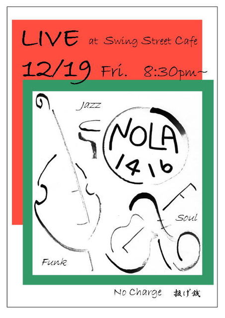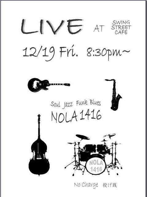 ●NOLA1416 LIVE● @ SWING STREET CAFE 12/19 FRIDAY 20:30頃 START NO CHARGE (投げ銭) 今年、最後のライブです。 盛り上がっていきましょう!
