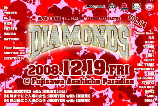 管理人様告知失礼致します。 今回でもう24回目!!! 今年2008年最後を飾る『DIAMONDS』は・・・・・ ▼年末全員集合SPECIAL▼ と題し今年一年間遊びに来てくれて『DIAMONDS』を支え続てくれた熱い 皆様への感謝を込めてお贈りしたいと思っております。 振る舞い酒等等・・・ ハンパじゃないお酒が出ること間違いなし!!! 当日は何が起こるかきてのおたのしみで〜〜す!!!! 詳細―――↓↓↓詳細―――↓↓↓詳細―――↓↓↓詳細―――↓↓↓ 【DIAMONDS−